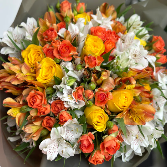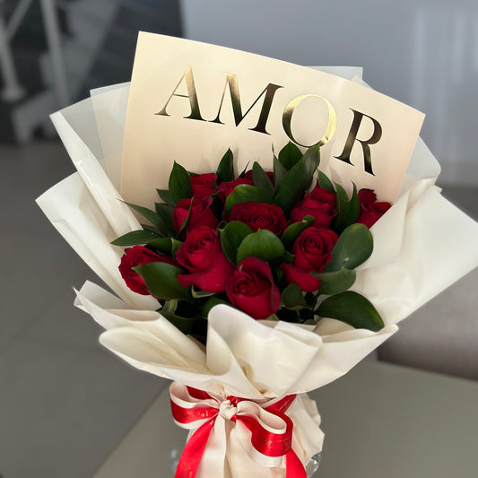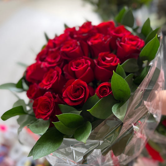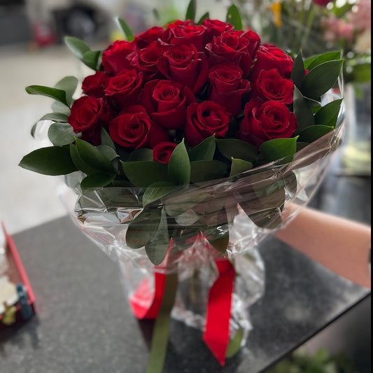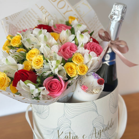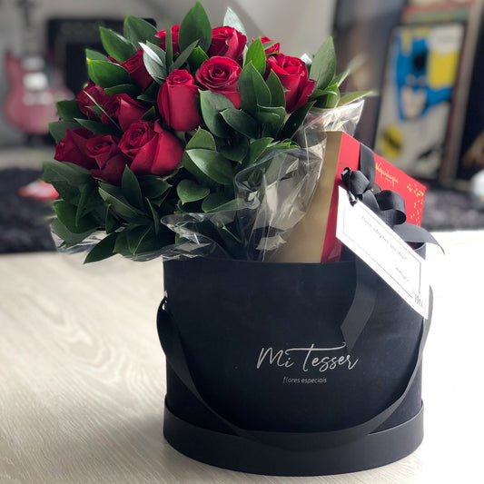 Flower-box com Bouquet de 12 Rosas e Coração de Chocolate Kopenhagen