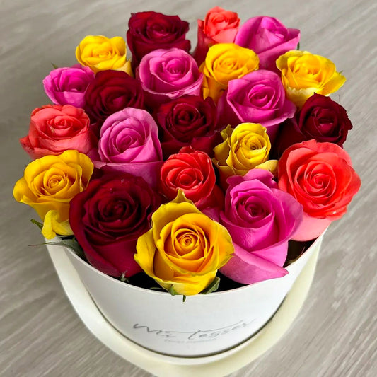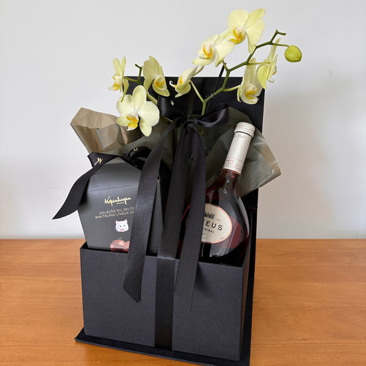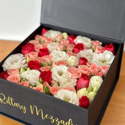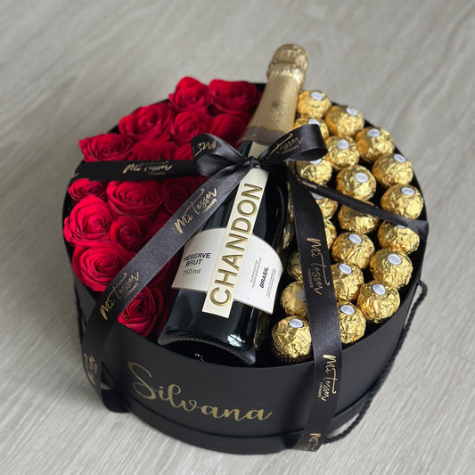 Flower-box com Bouquet de 12 Rosas e Coração de Chocolate Kopenhagen