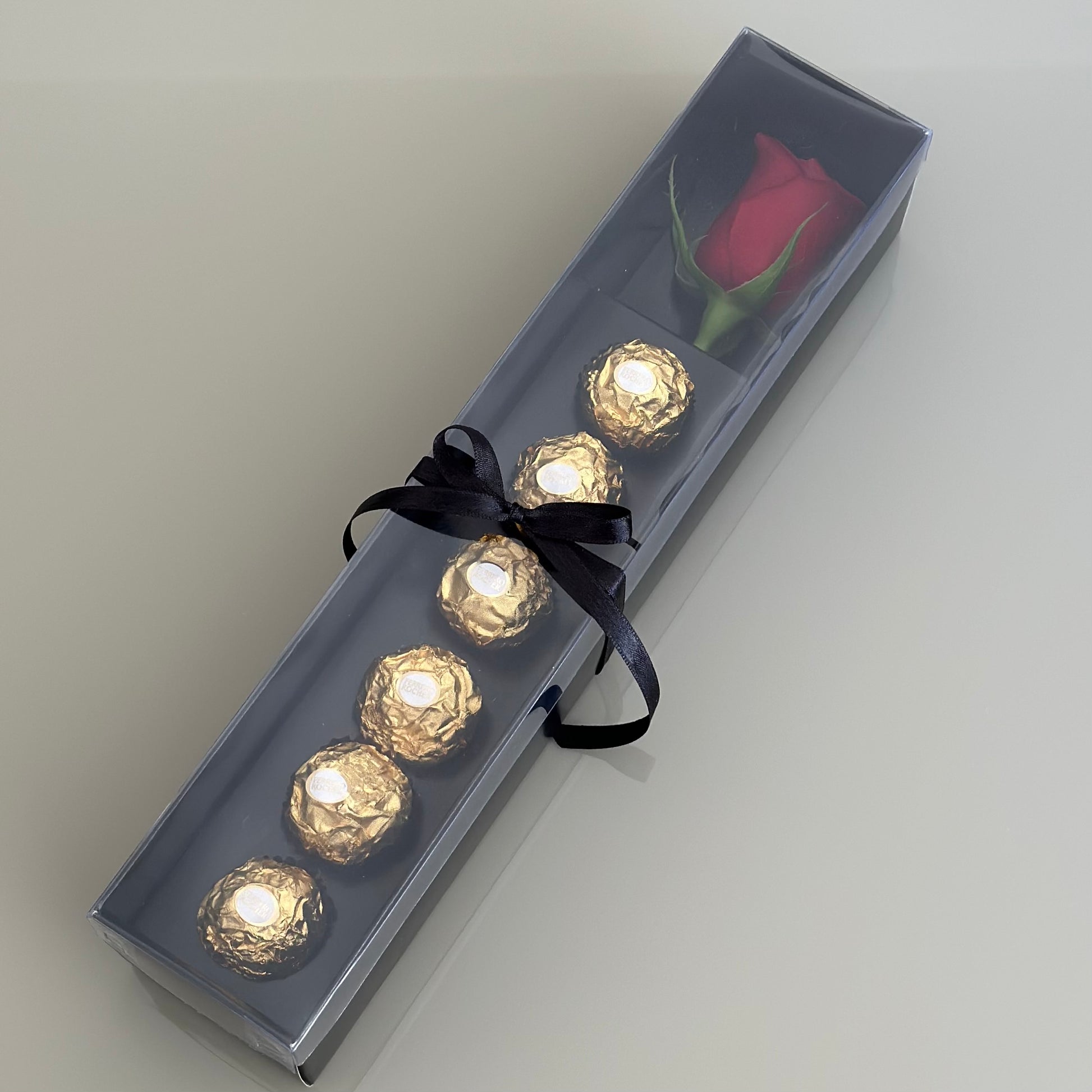 Inspirada no filme A Bela e a Fera, este presente inesquecível é amor em cada detalhe! Uma rosa individual na box, com 6 bombons Ferrero Rocher.